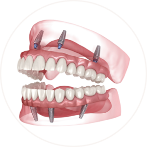 A female patient who attended with loose teeth following years of suffering with gum disease. Her teeth had become very loos and were drifting forward giving an uneven, goofy smile. Both her upper and lower teeth were loose and the thought of the forthcoming loss of all of the teeth was proving a very distressing prospect.